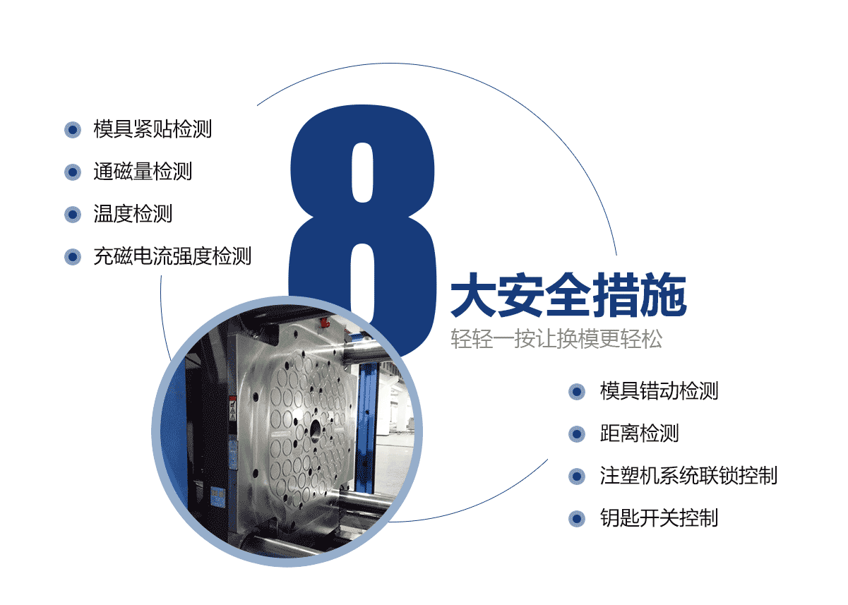 • 電永磁磁力模板大大提高注塑機換模效率。 自動化注塑機的換模方法僅需3分鐘即可完成。特大型注塑機模板的換模時間從超過2小時減少到10分鐘。